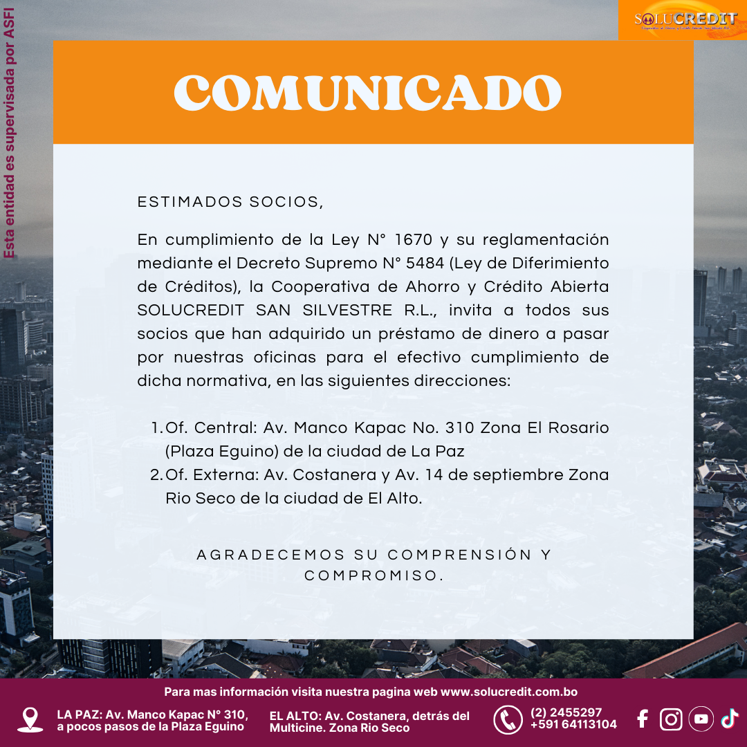 Para la seguridad de nuestros clientes y usuarios, la Cooperativa de Ahorro y Crédito Abierta Solucredit San Silvestre R.L. no solicita ningún tipo de información personal, usuarios, contraseñas u otro tipo de Información.