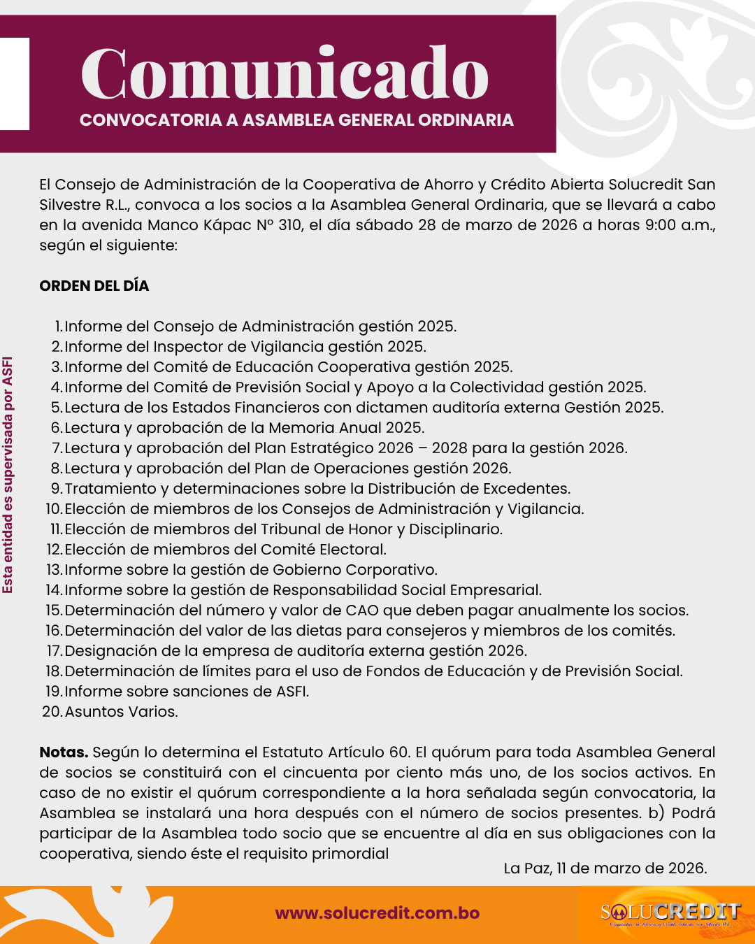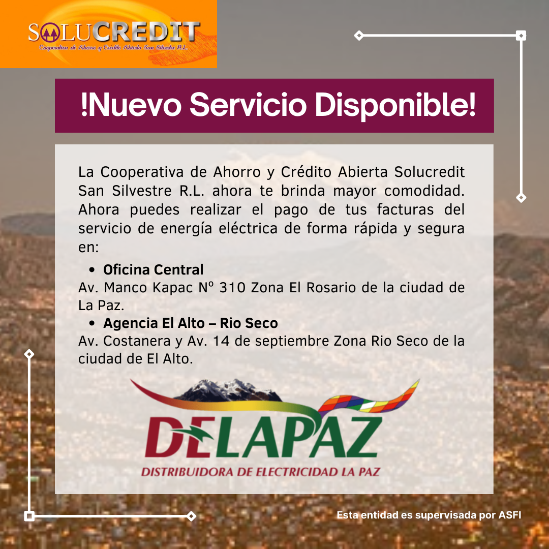 Para la seguridad de nuestros clientes y usuarios, la Cooperativa de Ahorro y Crédito Abierta Solucredit San Silvestre R.L. no solicita ningún tipo de información personal, usuarios, contraseñas u otro tipo de acceso.